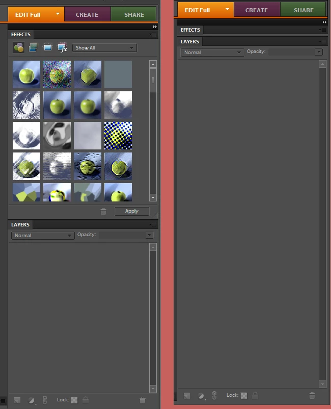The one on the left is how it always is when I open it the effects and layers both display normally upon opening. For some reason as of tonight its doing the one on the right. No matter how many times I open the effects section whenever I close and open it it returns to being closed. I haven't edited the settings.