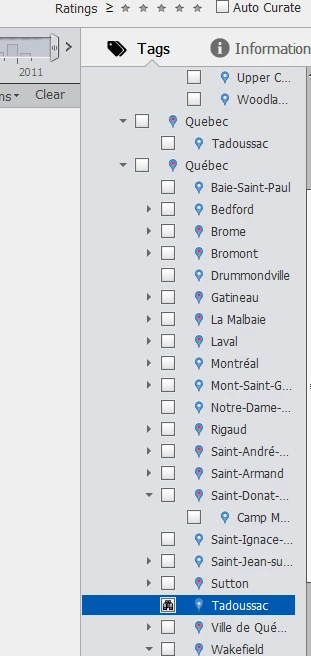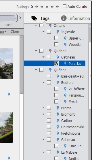 I just purchased Elements 2018 and started to tag my pictures for "Places". Was trying to place pictures in Gatineau Québec, and the organiser finds the location. No problem there. Placed additional pictures in the same area but they appear under a separate tree. I have a tree under Canada-Quebec-Gatineau-Parc Jacques-Cartier... and a tree under Canada-Québec-Gatineau-Train Chelsea-Wakefield.... As you can see, on has an accent on Québec, and the other one not.... Attached is a picture of the tree. How can I get rid of the one without the accent and move the Gatineau entries together. I have tried to move the "Parc Jacques cartier" down to the right one but it will not allow me to do it.