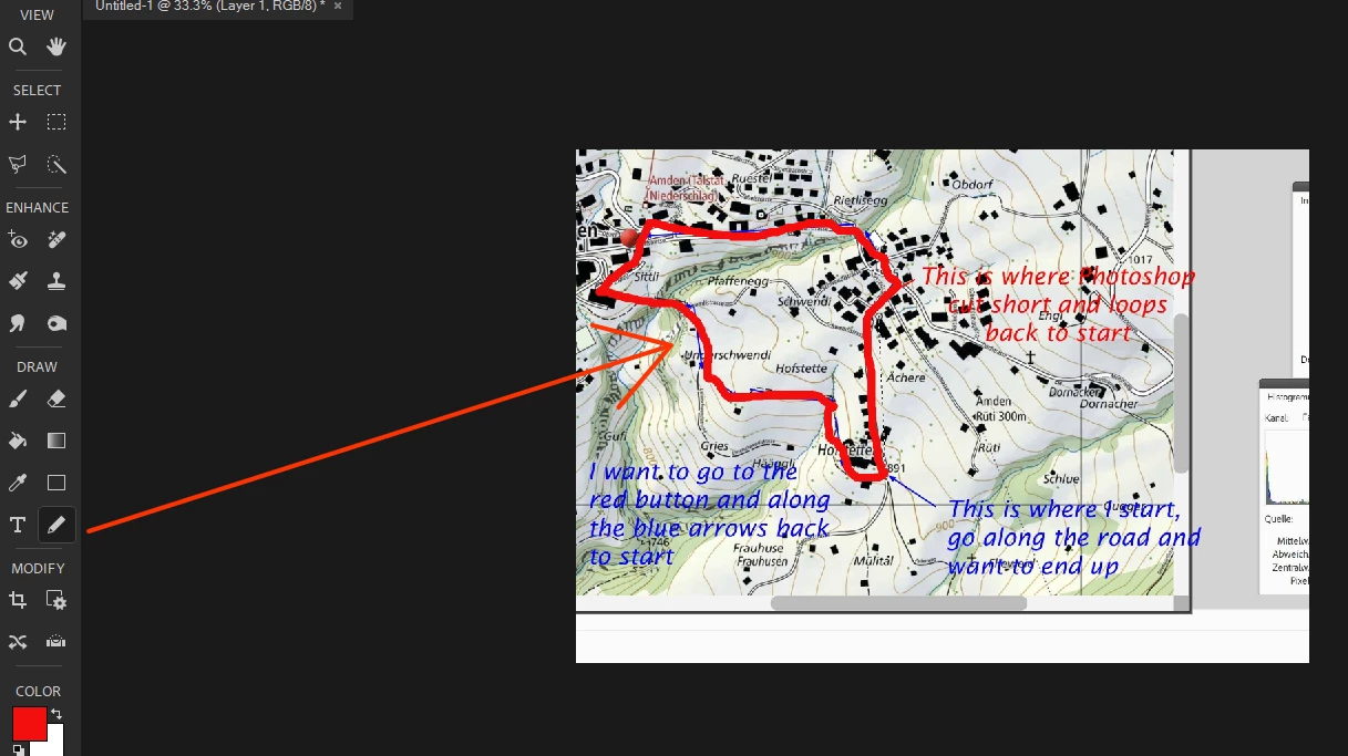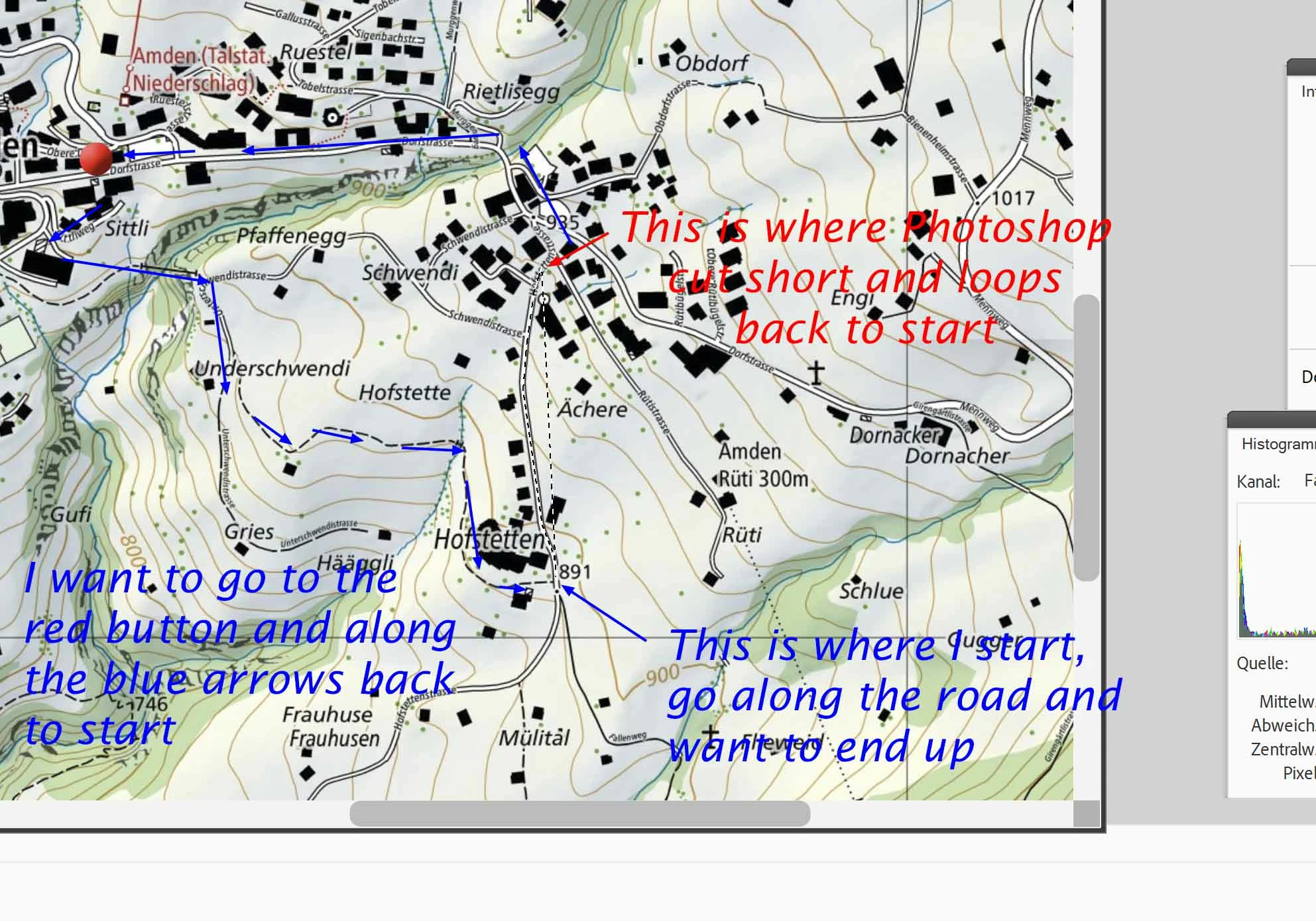 Das Polygon-Werkzeug funktioniert im oberen Bereich einer Grafik nicht. Man kann eine Form in einem Bereich von Null bis ein paar hundert Pixel vertikal nach unten nicht beginnen und nicht beenden. Beginnt man unten und gerät man in jenen oberen Bereich und klickt dort für eine Ecke, so wird die Form vorzeitig beendet, und sie lässt sich mit "Hinzufügen" in jenem Bereich nicht erweitern. Mir scheint das ein Programmfehler zu sein.