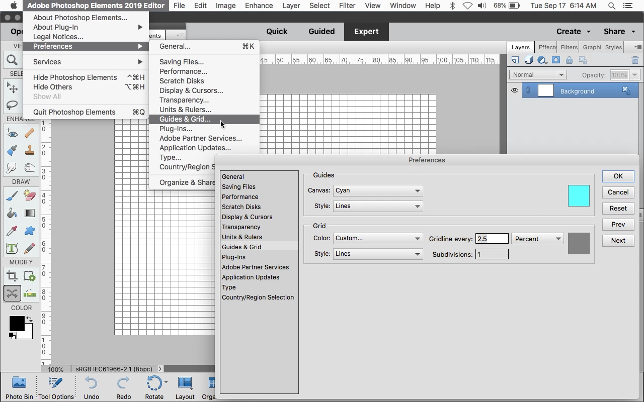 I want to change the grid size in PE 2019. I cannot find a Preferences under the Edit menu on a Macbook.
