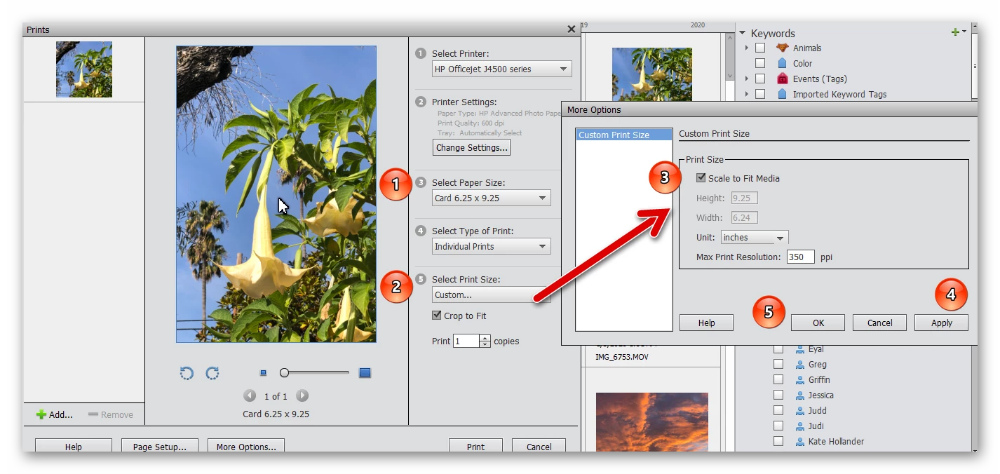 However after completing the project and merging the layers, when I went to "print" the notecard on my pre-ordered cardstock 6.25 x 9.25, Elements does not give me an option for paper size "custom"????? Only for a bunch of paper sizes that are not the size I need.