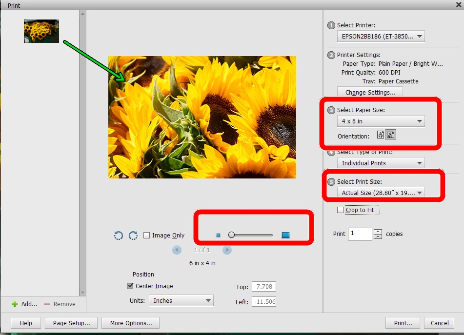 When I import from the scanner, the image appears normal on the screen. When I try to print it, it cuts off each end and only prints the middle third of the image. Even though I resize it smaller, it still only prints the center third only.