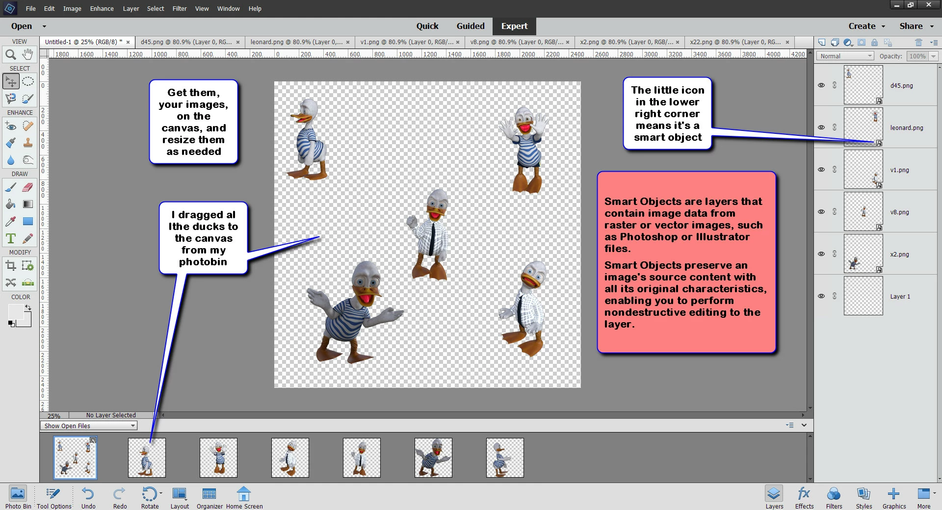 What is a good way to drag images from the photobin into a blank canvas without the image taking up the whole background/layer? I tried resizing the image beforehand but inserting the image into the blank canva causes the iamge to take up the same size? The goal of my prpoject is to drag and drop several smaller resized images into a larger canvas size.