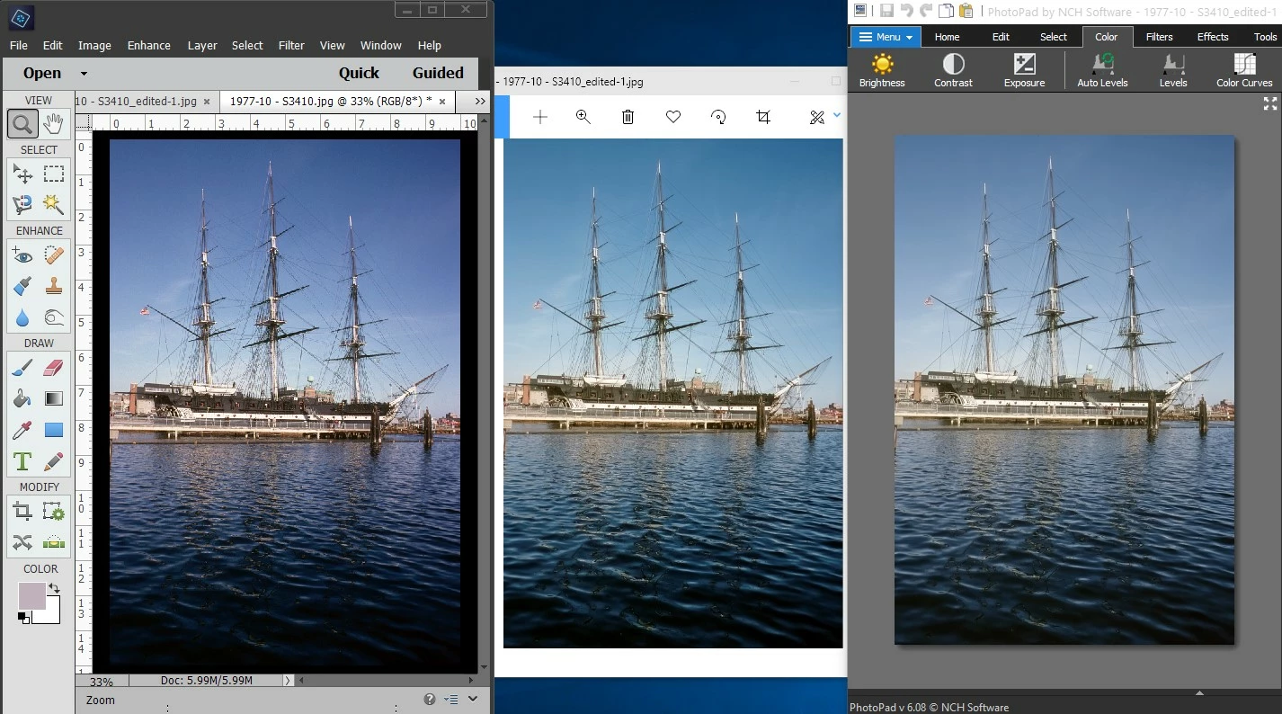 I am really struggling with getting the correct colour balance for photos. The embed colour profile is Adobe sRGB, but the colours do not look correct in PE - if I correct them using photoshop to what looks acceptable, then they do not look right using other software that is set-up for Adobe sRGB, on my Samsung tablet or Panasonic TV. The attached screen shot shows how different application, i.e. PE, Windows Photo app and NCH Photopad displaying the same slide - non is ideal, but the NCH app at least displays the photo with colours the closest to the original slide from which the photo was scanned using a Nikon LS 5000 scanner with Adobe sRGB as the colour profile and to those seen on my Samsung tablet and Panasonic TV, albeit a bit washed out - PE is probably the furthest from it.