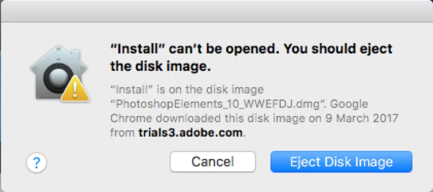 I have just rebooted my mac and want to reinstall Adobe Photoshop Elements 10 again. I have tried several times but only get to the point where it's downloaded but I can't install it. When I click the install icon the system says: ""Install" Can't be opened. You should eject disk image". But when I click on "Eject Disk Image" nothing happens. Is there anyone who can help me?