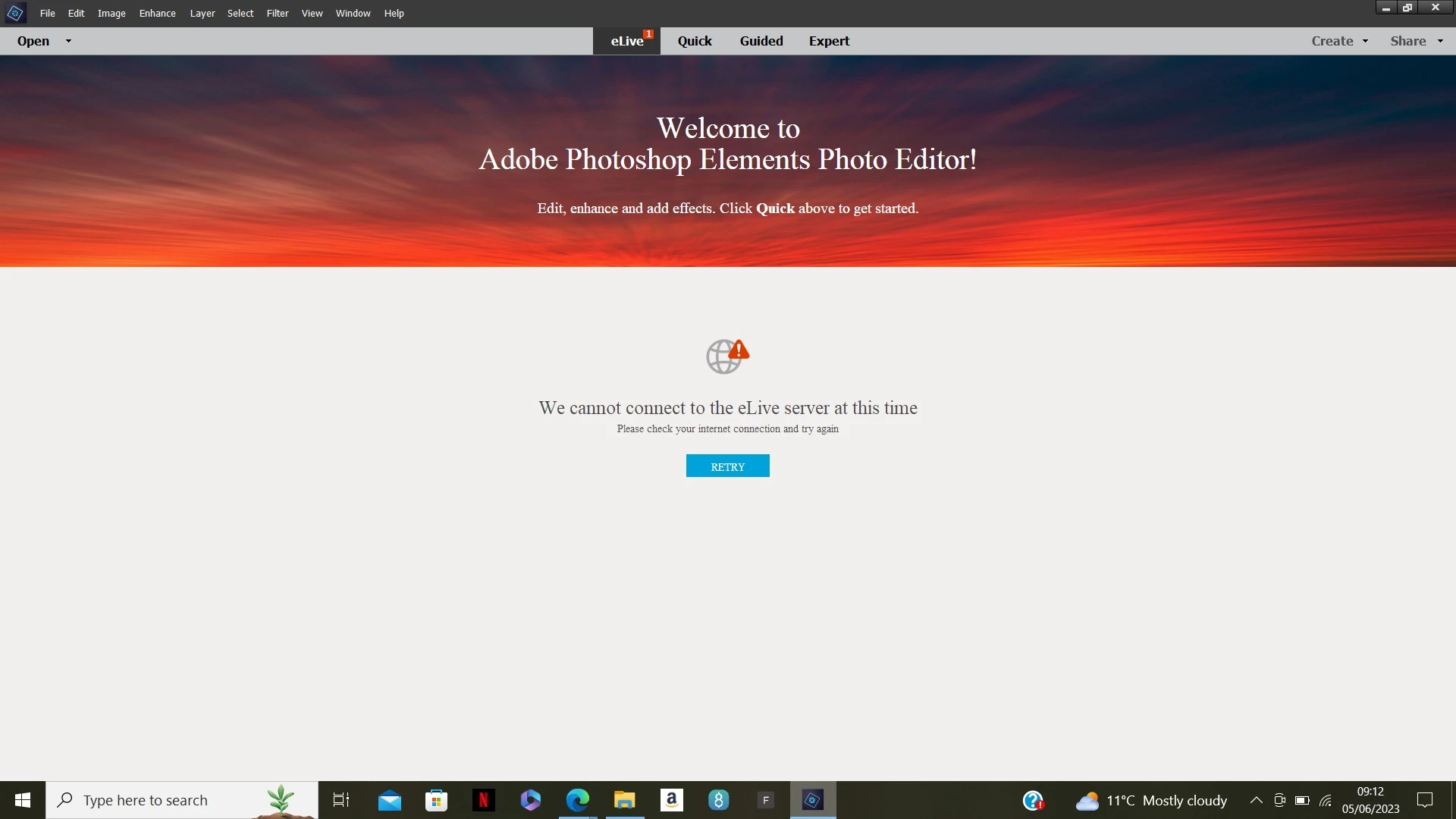 I use Windows 10 and PSE14 and yes I have just started to be directed to eLive when starting PSE and I would like always to go to EXPERT. The eLive page displays the following message. I have tried to reset preferences but that too fails. Can anyone help?
