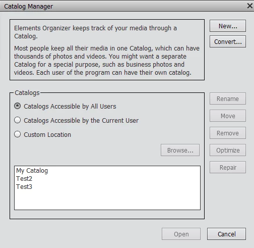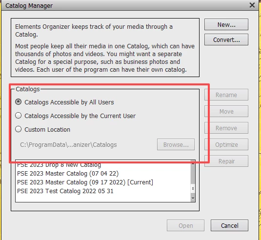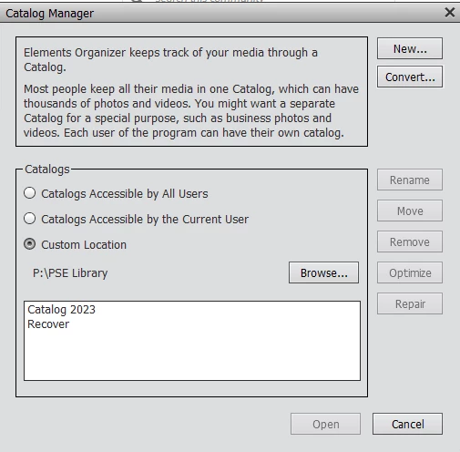 I cannot open my PSE 2020 catalog - it gives me the error "The catalog could not be opened. An internal programming error occurred."