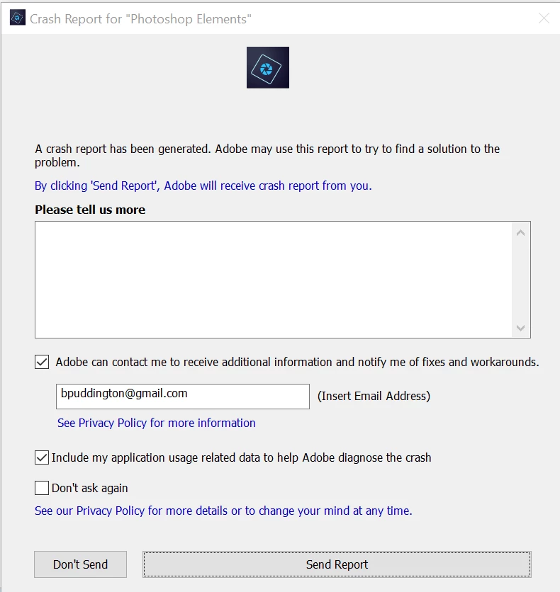 Photoshop Elements 2020 Freezes whenever I go to File > New > Blank File. I have rebooted several times. I have uninstalled and reinstalled PSE 2020, all with no success. Every time this happens, a screen pops up asking if I wanrt to send the crash details to Adobe. Each time, I click on yes. Each time, Adobe ignores me by not responding. I am getting quite frustrated.