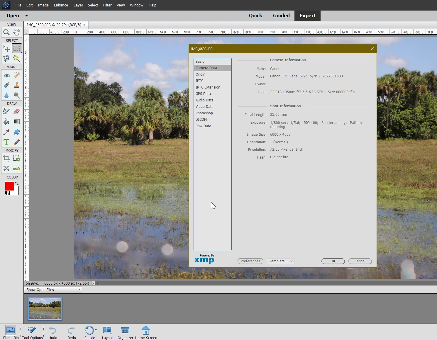In the Organizer, select a photo then click on the Keyword/Info button in the lower-right corner, then click on the Metadata item in the right-hand panel.