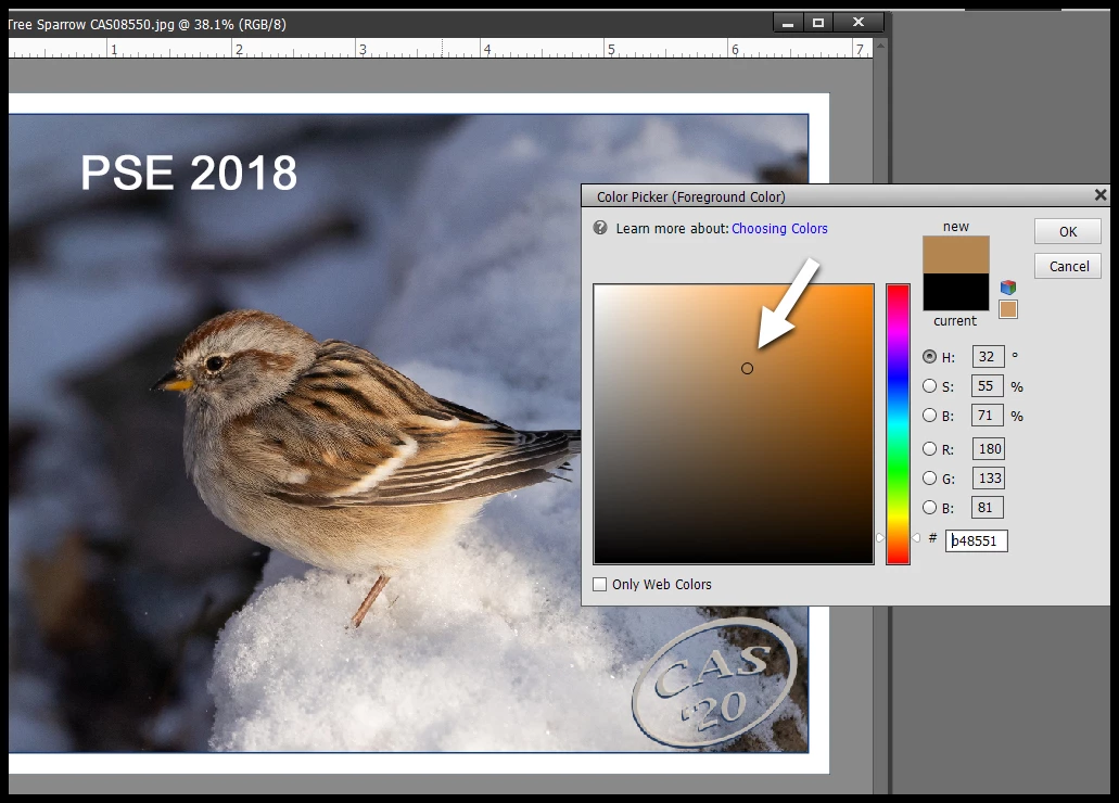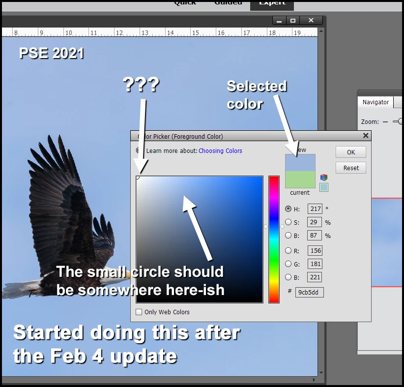 But now in 2021 after the update on Feb 4 or so, when I click on the foreground color to invoke the color picker tool, and then click somewhere darkish in the image to select the color I desire, the "new" color appears in the color picker panel, however, there is no little round circle to be seen anywhere in the color window and that's important. If I pick from a light region in the photo, the circle will appear in the upper left (pure white ?) even though the correct color is displayed in the "new" window and the RGB color units correct.