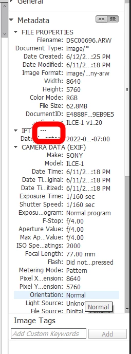• Click on the 3 dots next to the IPTC label and it will open another dialog with the full IPTC information.