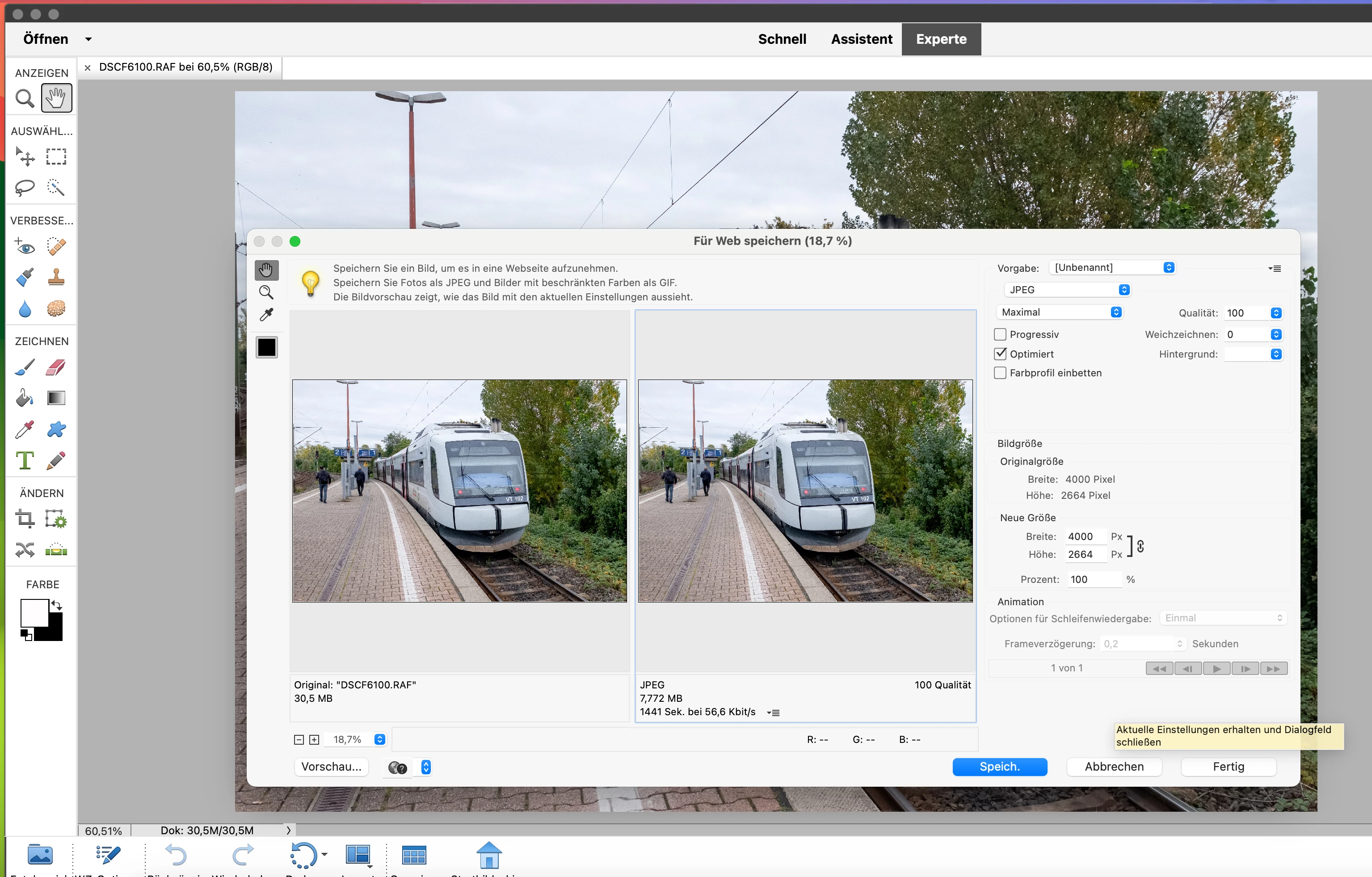 Eine komplette Voranansicht des Fotos ist nicht mehr möglich. Der fertige Export nach dem Druck auf die Schaltfläche "Speichern" ist jedoch einwandfrei und komplett vorhanden.