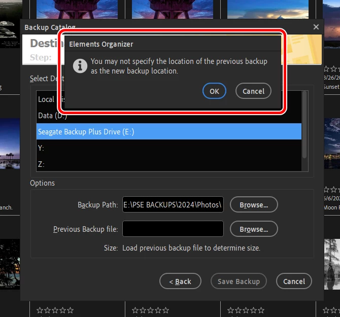 To start the Incremental Backup, I select the path of my previous Full Backup and I get this message: