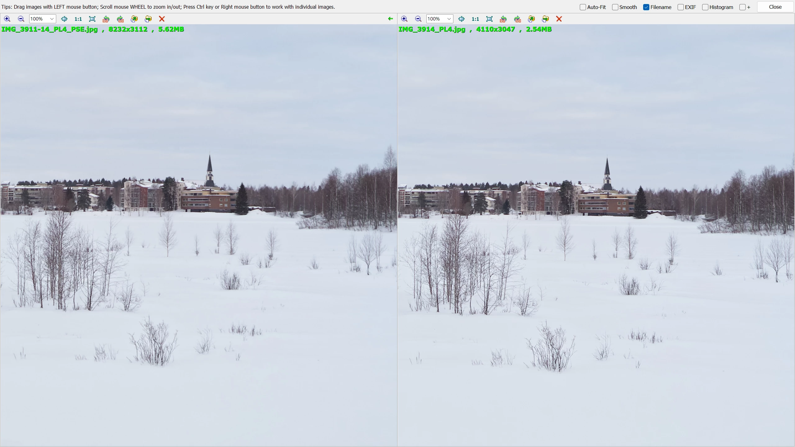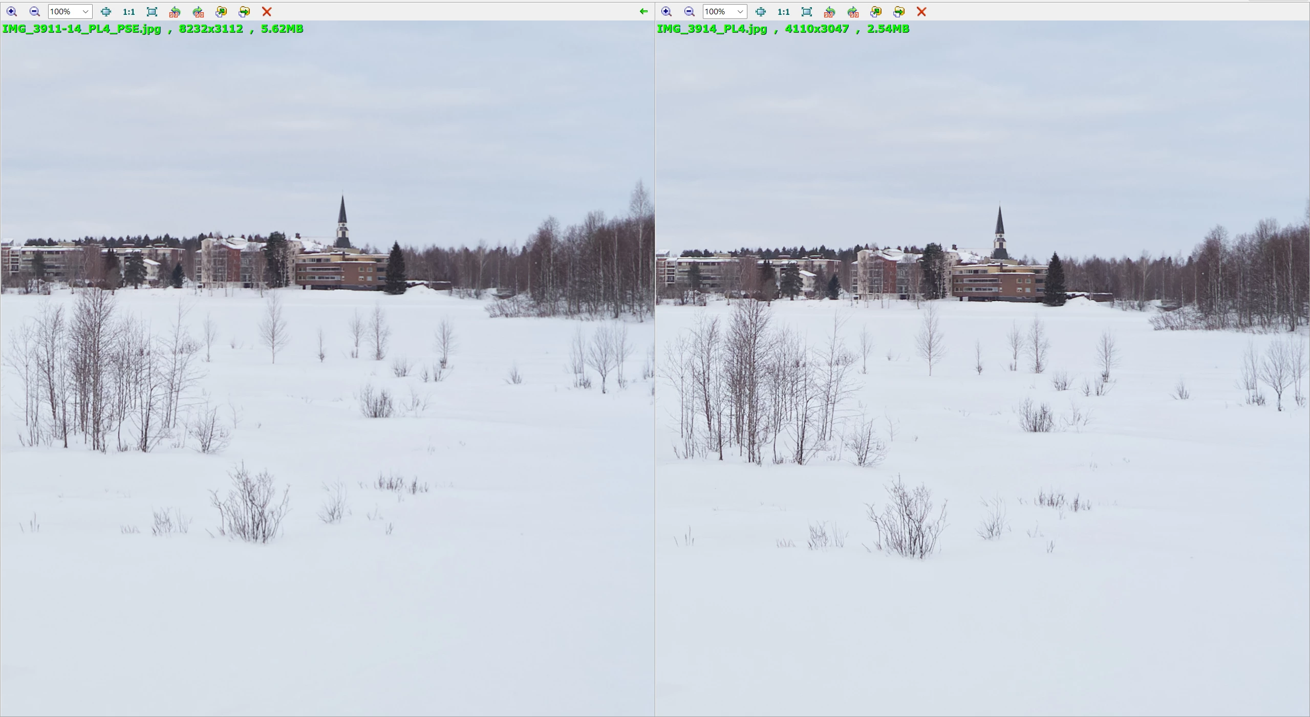I'm attaching a PNG screenshot of two images looked at in FastStone (but the problem is visible in PSE 2024 itself). The panorama is on the left.