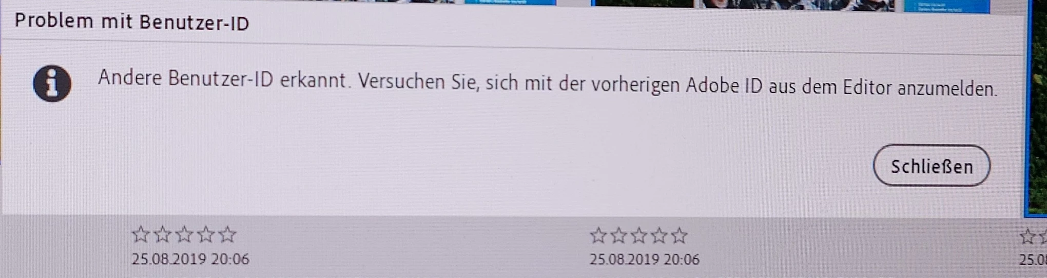 "Different user ID detected. Try to log in with the previous Adobe ID from Editor."