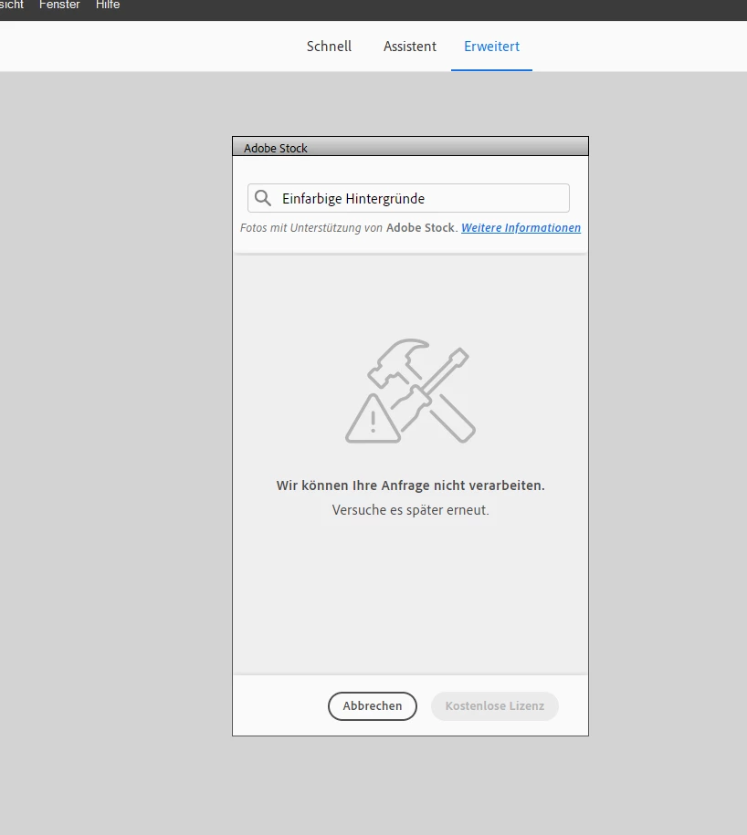 ich kann in Photoshop Elements 2024 keine kostenlosen Stockfotos laden. Erhalte immer ein Fenster mit dem Hinweis: Wir können Ihre Anfrage nicht verarbeiten. Versuchen sie es später erneut.