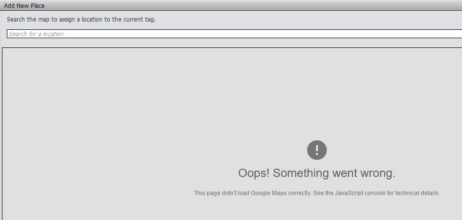 I run Adobe Elements Organiser 2018 Ver 16 under Windows 10 and am getting an error when I try to tag Places (see attached file). Can anyone advise how to get google maps and place tags working. My browser is FireFox.