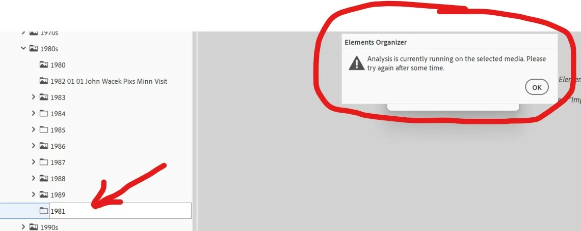 I can successfully add a "New File", but when I write the name, it gives me this Elements Organizer popup window that says "! Analysis is currently running on the selected media. Please try again after some time. OK"