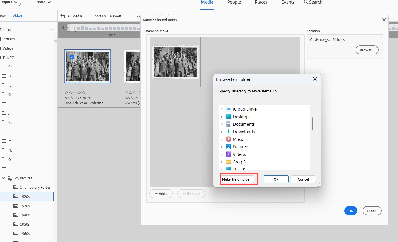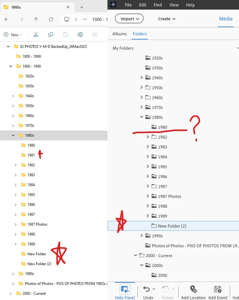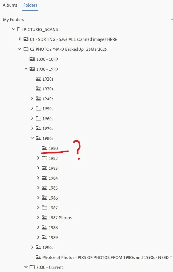My QUESTION is: If one of the subfolders (in this case, the 1981 folder) is empty, it doesn't seem to show up in my Catalog Tree. If I don't see a Year folder in the tree, I try to make a new folder and PSE tells me the folder already exists. HOW do I "see" the folder IN PSE so I can sort my images into the proper Year folder?
