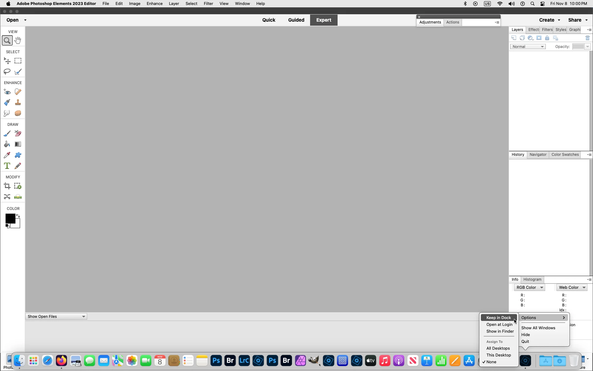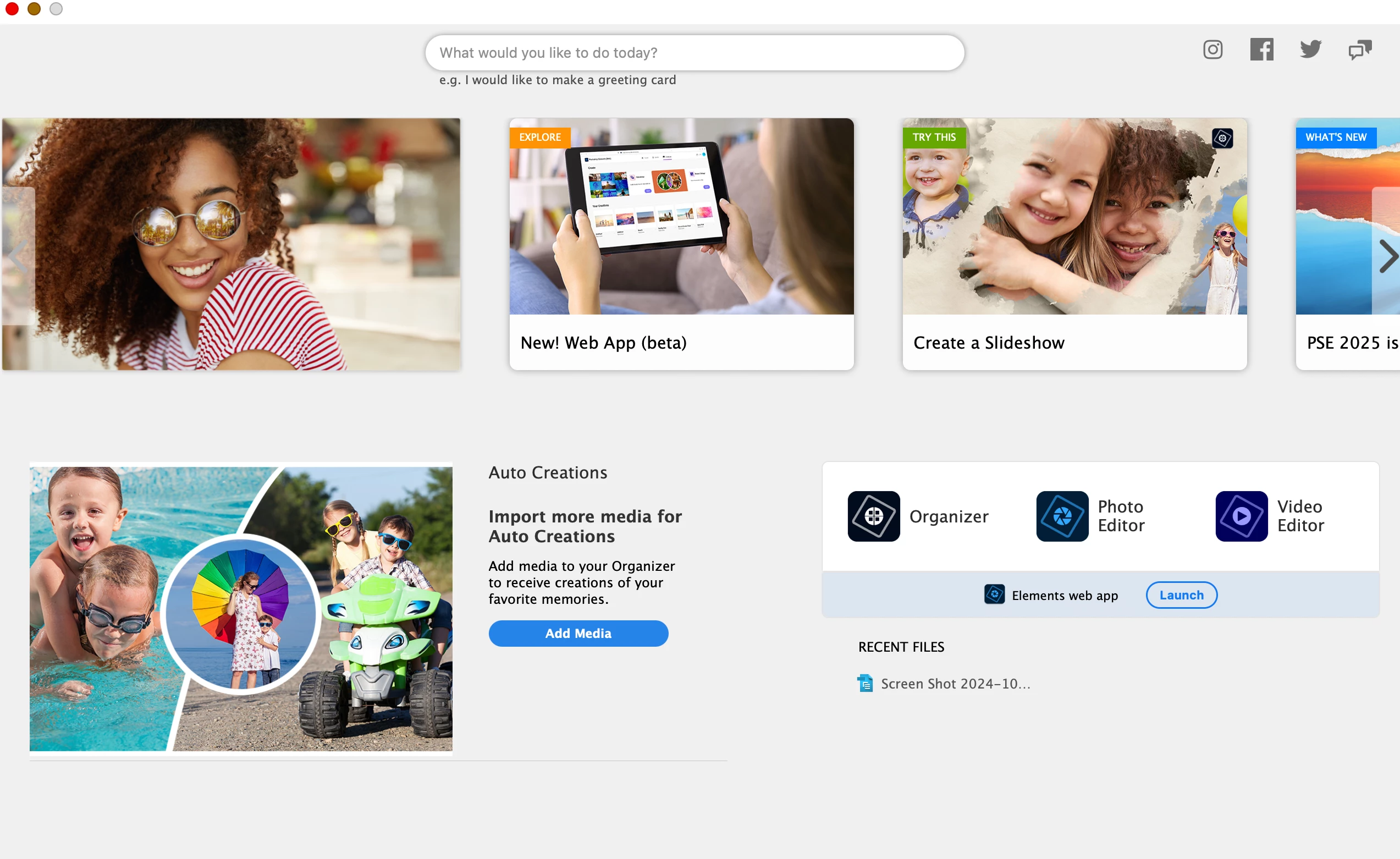 I find the automatic HOME SCREEN as pictured HIGHLY ANNOYING as I only want to use photoshop elements and not the organiser or the Video editor. I'd like to turn this off in preferences. Please UPGRADE to allow this.