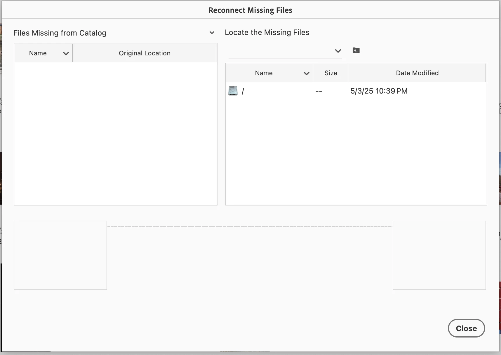 I am running Mac OS 15.5. I just upgraded to PSE 25. I converted my 3 catalogs. Two are fine. The third shows this screen when I try to Backup and/or Reconnect Missing Files. I optimzed the catalog but this still appears. I also tried letting it auto reconnect, and it ran through everything but obviously since so files are listed there is nothing to reconnect. Any ideas?