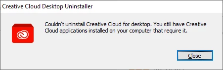 Recently I had to reinstall windows 10 which means I had to reinstall Photoshop Elements 2021. I went to my Adobe account to do this. I only downloaded PSE and Premiere Elements. I did not download Creative Cloud, I have never used Creative Cloud. I keep getting notices about a Creative Cloud update and I just close them. I have tried to uninstall Creative Cloud but it will not let me. When I try to unistall it I get the following window...