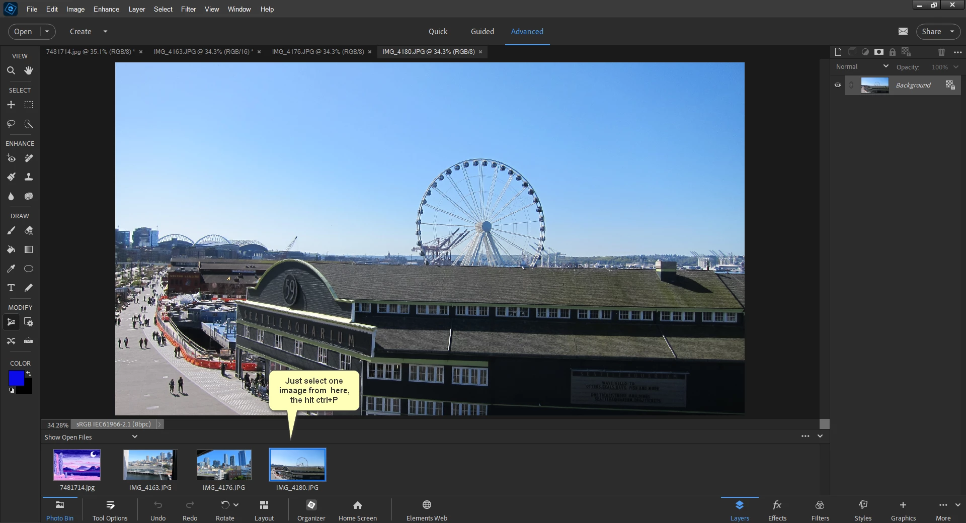 if i have 10 tabs (each one with a separate image) open in PE, and I want to print one of the images, I have to first "remove" each image one by one from the print window. Otherwise it will automatically print the image that is at the top of the list. i am consistently printing the wrong images because of this clumsy feature. Is there any preference i can click on that will allow me to CHOOSE which image i want to print, rather than have to remove all the images I DON'T want to print? I hope theres some way to do this! thanks