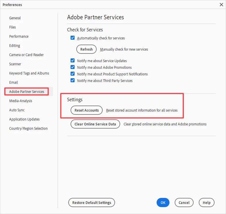 I also tried resetting the account settings but it didn't fix the issue. However if you need to change the account for another reason, the setting is in different places for different versions. For Elements 2024, you will find it under the Organizer's Edit>Preferences>Adobe Partner Services dialog: