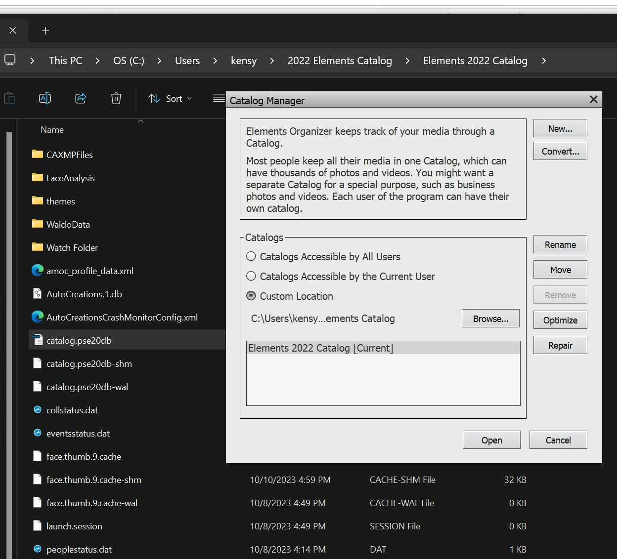 Given the date on catalog.pse20db, plus the other support folders and files in the folder Elements 2022 Catalog, it seems to my admittedly ignorant eyes, that catalog.pse20db is the better of the two catalogs to use. What do you think?