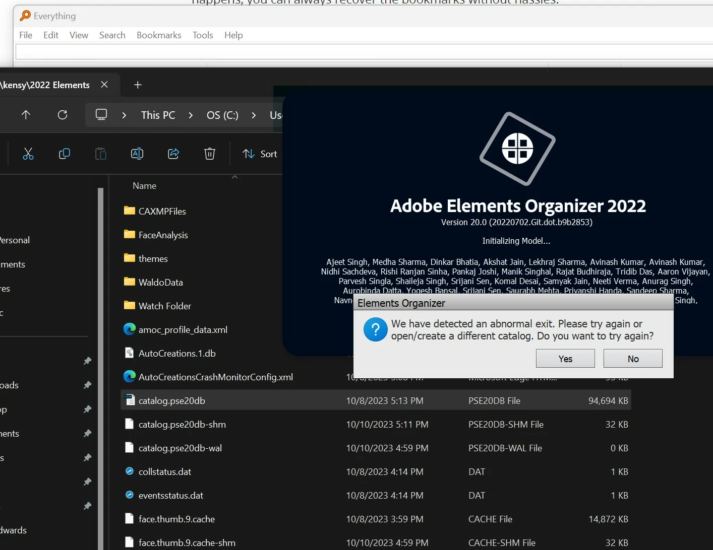A short while earlier, I attempted to open “catalog.pse20db” by double-clicking it. That failed and Elements 2022 crashed; a crash report was sent to Adobe, together with my notes on the background. I thought I should try that again, so I could document the results. This time after double-clicking “catalog.pse20db,” I received the following: