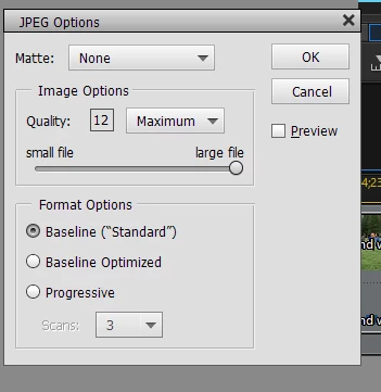 When I "Save As" an image to JPEG or TIFF formats, for example, I always get prompted with the Options box after I specify the filename and location. Is there any way to stop getting this and just have my defautlts be what I want, i.e, Quality Options, etc.. It's an extra step that I don't need. I always want to save my JPG files at maximum quality.