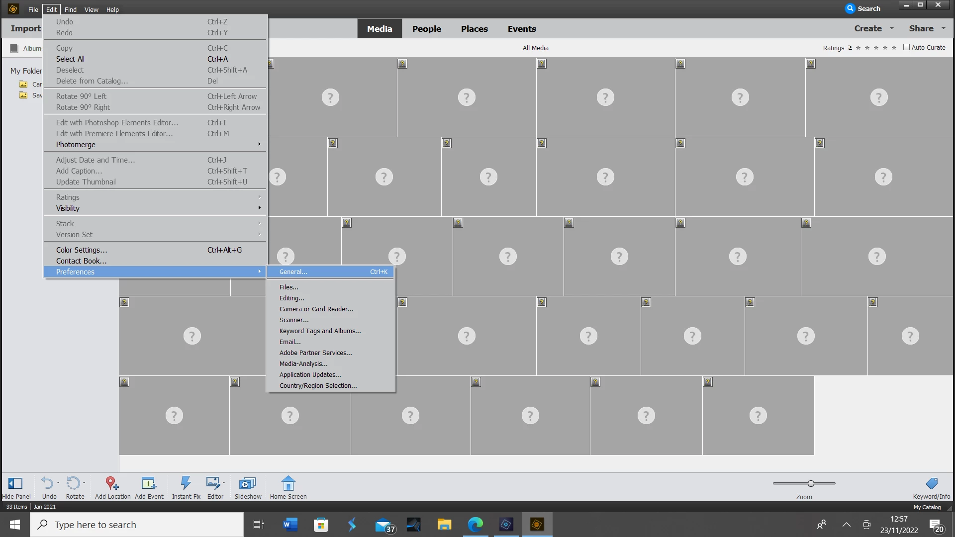 Hi, the Photo Editor on my Elements 2021 won't open. Error message states that the scratch disk is full. I set the scratch disk to be an exterbal hard drive which has masses of free space so that can't be right. I'm on Windows 10. Online solutions all say open Edit/Preferences/Performance to check settings but when I open Edit/Preferences in Organiser there is no tab for Performance. Please help!