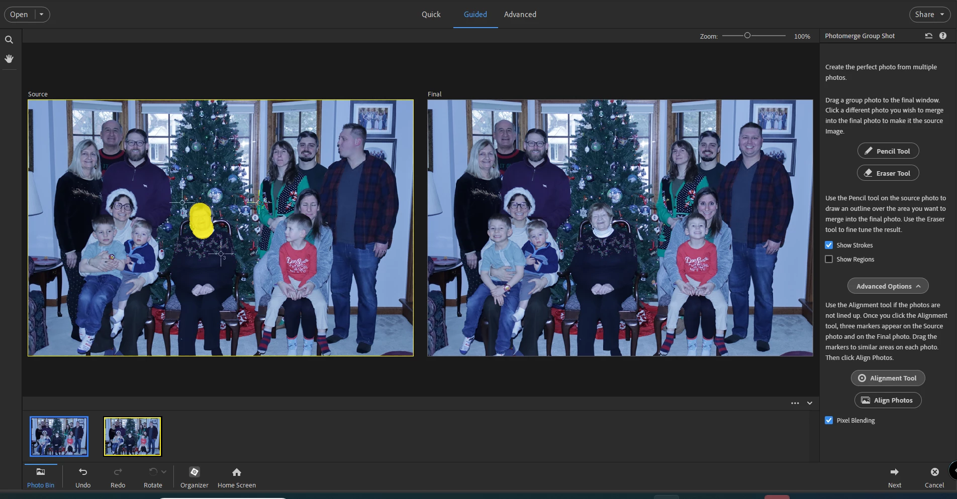 Simply drag the photo with the group smiling from the photo bin to the right-hand window. Drag the smiling mom photo to the left. Then use the pencil tool to draw around mom's head. You will end up with something like this: