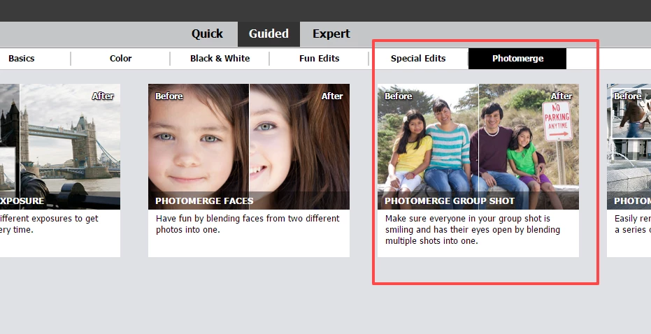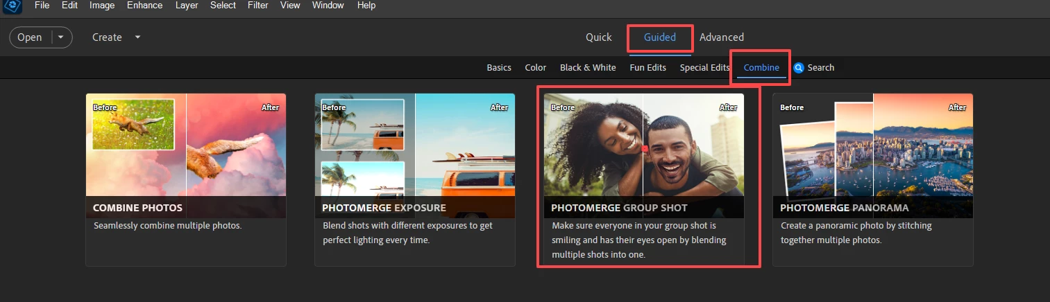 What version of Elements do you have? In Elements 2025, the Guided Edit is under the Combine tab: