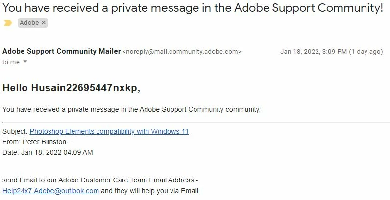 I am very new to the community. I am trying to upgrade my Photoshop Elements 10 to 2022. While in the way, I have asked this discussion community a question about the product, and later received a private email from someone saying: (You can Directly send Email to our Adobe Customer Care Team Email Address:- <scammer's email address removed> and they will help you via Email). So, I sent my second inquiry about whether PE 2022 supported Arabic to this address. I got a response from the same address suggesting to me “Photoshop CS 6 Perpetual License ME Enabled version” for $399.99. Will this be a legitimate package? Can this person be from Adobe team? I have done some search on the PS CS 6 and read some threads on it, and found this, “Adobe stopped selling CS6 entirely several years ago. So the CS products are not being made by the company, nor legitimately for sale through any channel in any country, from any vendor or reseller”.