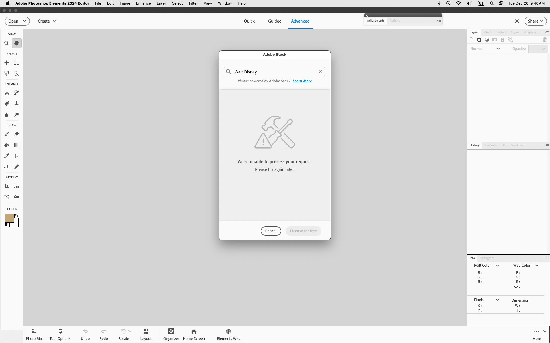 Merry Christmas to all. I've just downloaded Elements 2024, trying to use the stock photo tool, and it brings up significantly less, and unuseable pictures. E.g typing Walt disney into the tool, brings up no images where if you do the same search in the web subscription site, it brings up the sort of quantity you would expect from a stock site.
