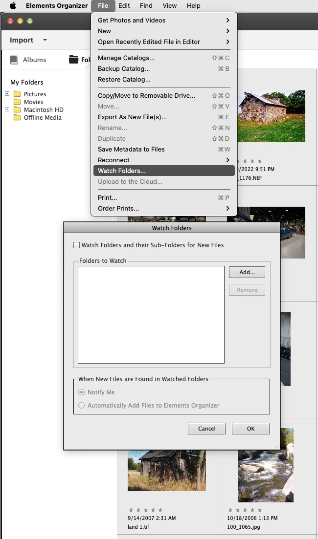 In the Organizer go to Edit>Watch Folders and in the dialog select the option that best suits you.