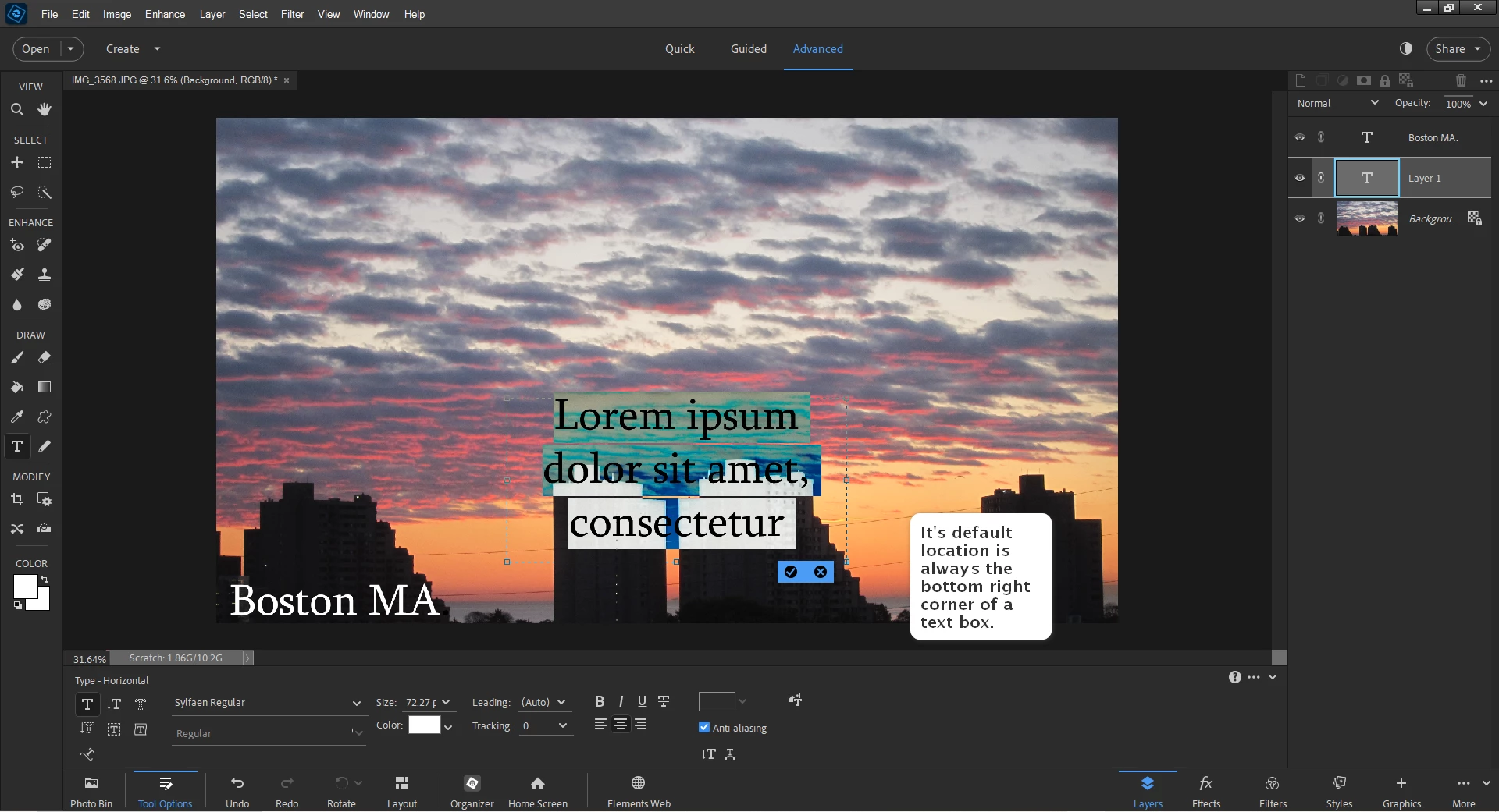 Just type your text anywhere on your canvas- like in the middle of the image, confirm it- then just move the text box where you want it.   In your case it appears to be the bottom left corner.