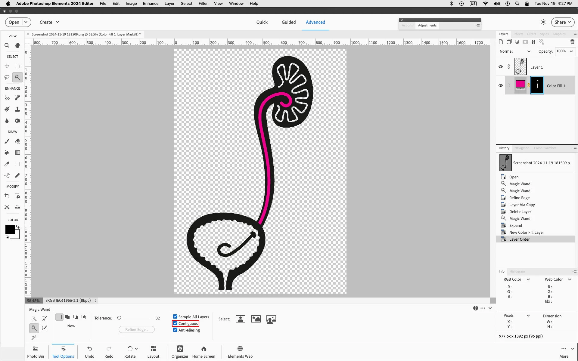 Ich habe eine Art Piktogramm auf transparentem Grund, und möchte eine schmale Linie mittendrin Magenta färben. Leider färbt das Füllwerkzeug immer den gesamten Hintergrund. Zuerst war noch eine Lücke zum Hintergrund, diese meine ich aber geschlossen zu haben. Manuell diesen schmalen Bereich auswählen ist extrem schwierig, und es gibt bestimmt eine bessere Methode, ich hoffe ihr könnt mich erhellen.