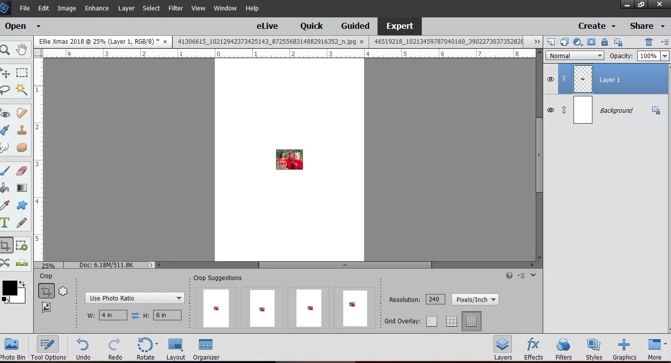 I hope someone can help me. I am using Photoshop Elements 2018. I am trying to shrink about 10 4"x6" images so that I can print 2 per 4"x6" page. I made a new blank file that is 4"x6" and is white. I went through and resized all 10 of my images from 4"x6" to approximately a 4"x3" size so that I could fit 2 images on each 4"x6" piece of paper.
