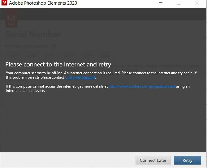 Trying to Activate Photoshop Elements 2020 and get "internet not connected"