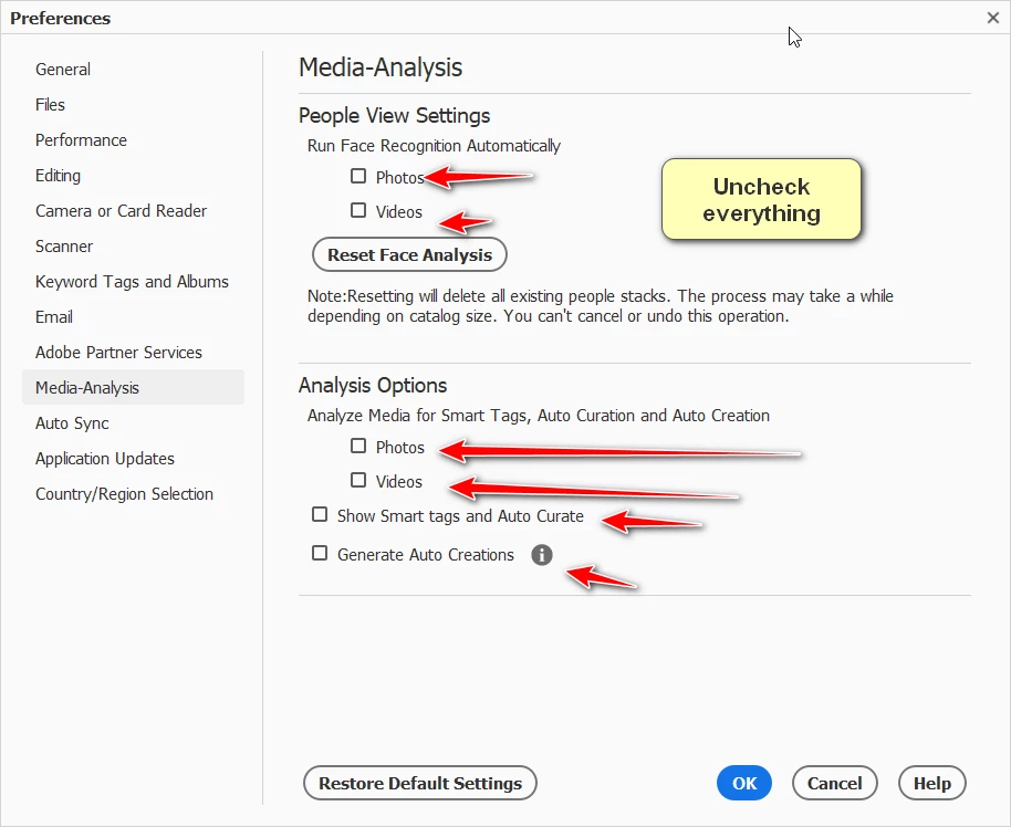 Uncheck all the things the red arrows are pointing to in the ORGANIZER preference file. All the thingds are in the media analysis tab.