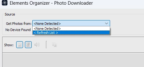I have purchased a canon R5 mark2. I have adobe elements 2025 with version 17 camera raw installed. When I try to import photos from camera or card reader, the photo downloader says <none detected>. With that being said, if I import "files and folders" my files come up EOS_Digital (I:) I have a XFVC, MISC, DCIM, and a CRM folder appear on the right. The MISC file shows up under properties as a exFAT file with how much information is on the CF express B card. If I click on the DCIM file, a 100EOSR5 file shows up, and when I open up that file, all my pictures show up. If I highlight all my photos and click open, All my pictures show up in organizer (all my pictures are RAW CR3). I can edit them, save as jpeg or any format. When I click the "Back" arrow they show up with my other photos. Which is normal for me, but when I unplug my card reader from my computer, and try to open one of the pictures, it searches but can't find the pictures. For some reason its not downloading the pictures. Any help in getting the pictures to come up when I try to import from camera or card reader would be great.