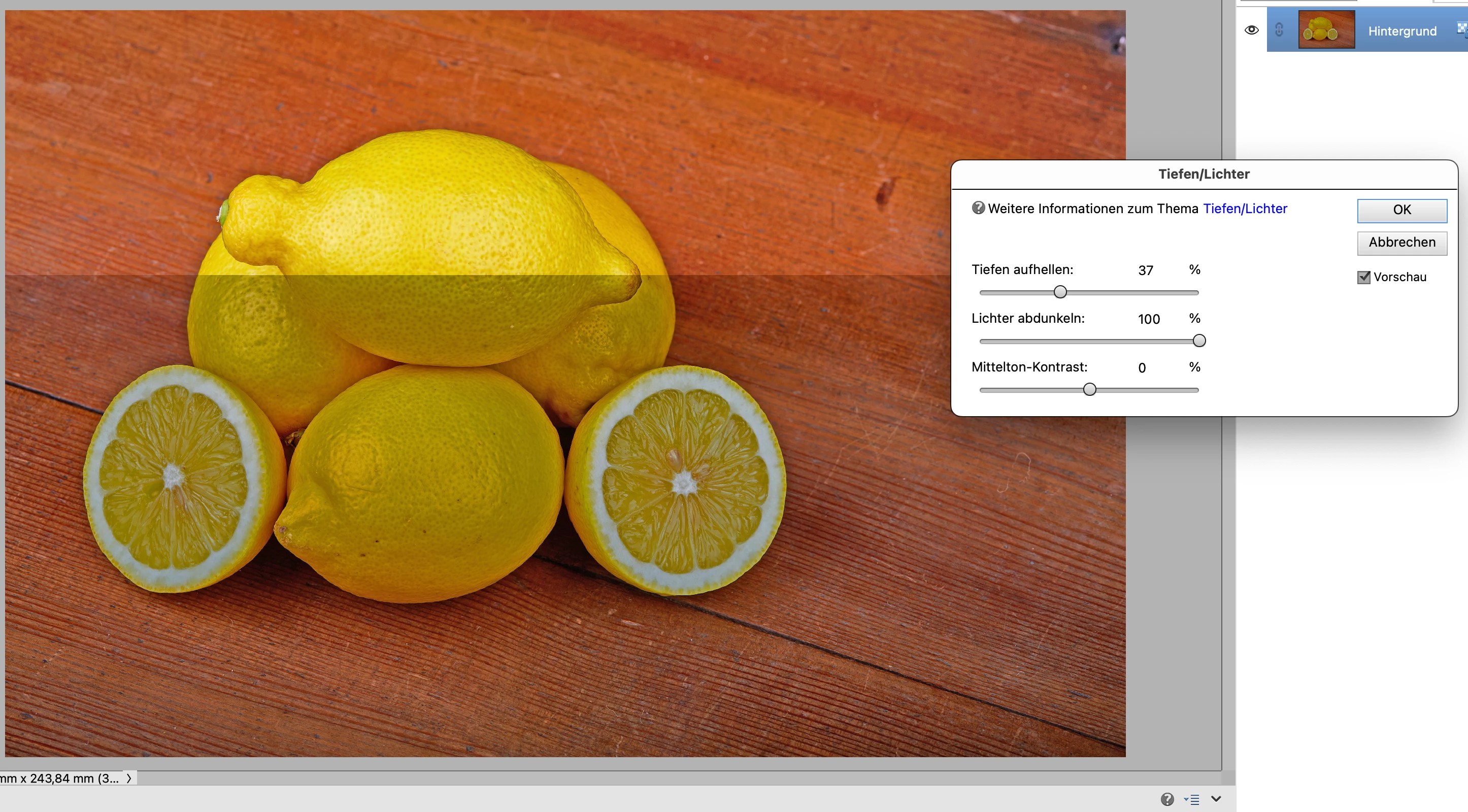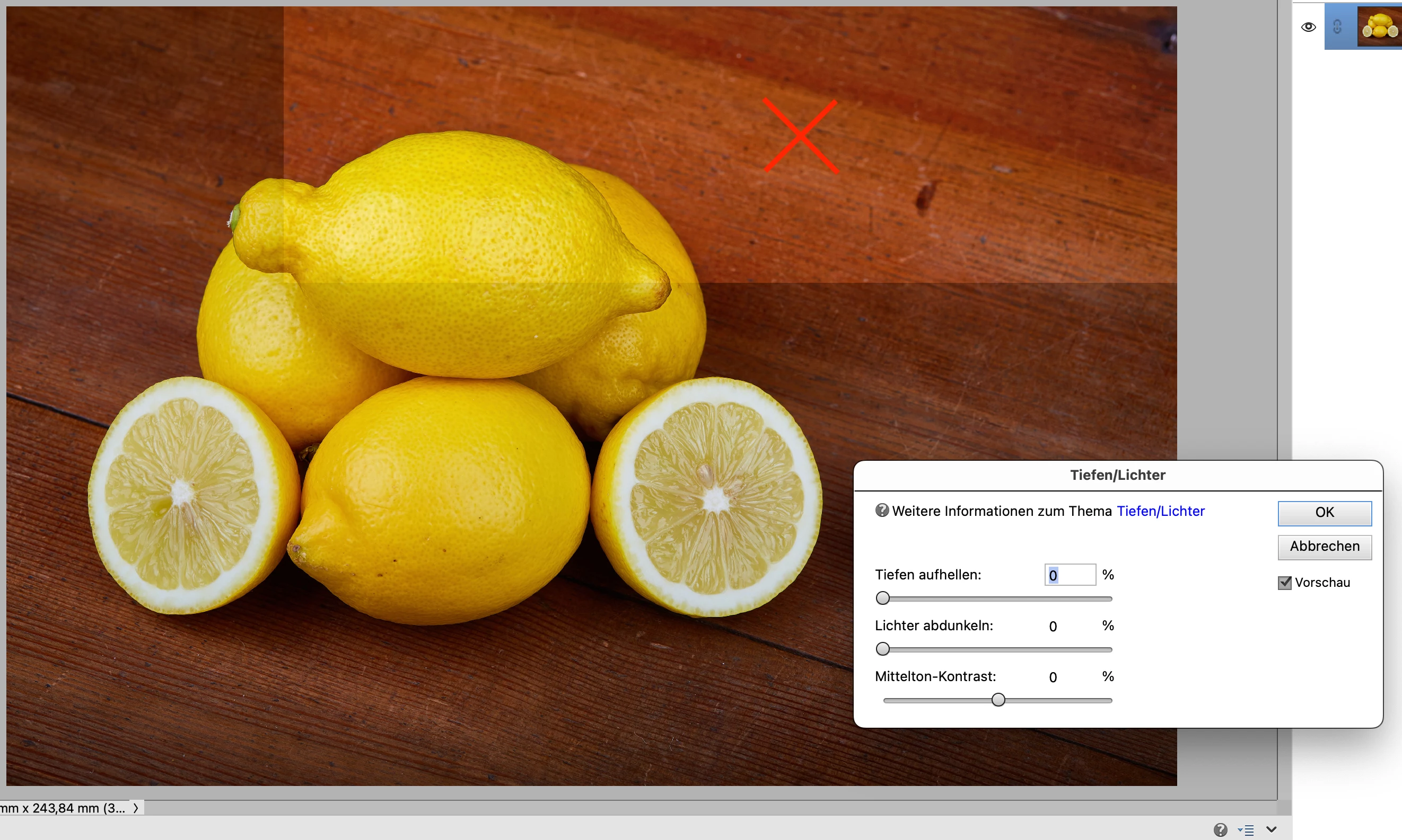Der Dialog Tiefen/Lichter kann nicht oder nur sehr träge mit aktiver Checkbox "Vorschau" betrieben werden. Ich muss den Haken in Vorschau immer wieder deaktivieren und aktivieren damit das Bild geändert wird. Oft wird nur ein Teil des Bildes aktualisiert (Screenshot). Die anderen Module – z.B. Tonwertkorrektur – laufen aber flüssig.