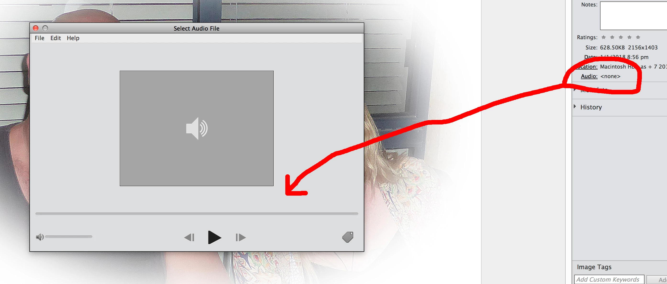 Have Elements 15. Tutorial suggests that I can add my own recorded audio file to a picture. When I bring up Information panel and select Audio