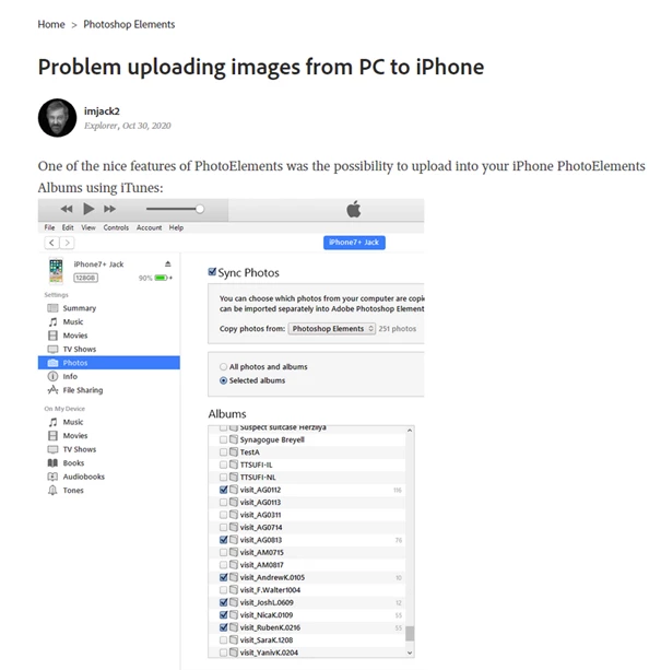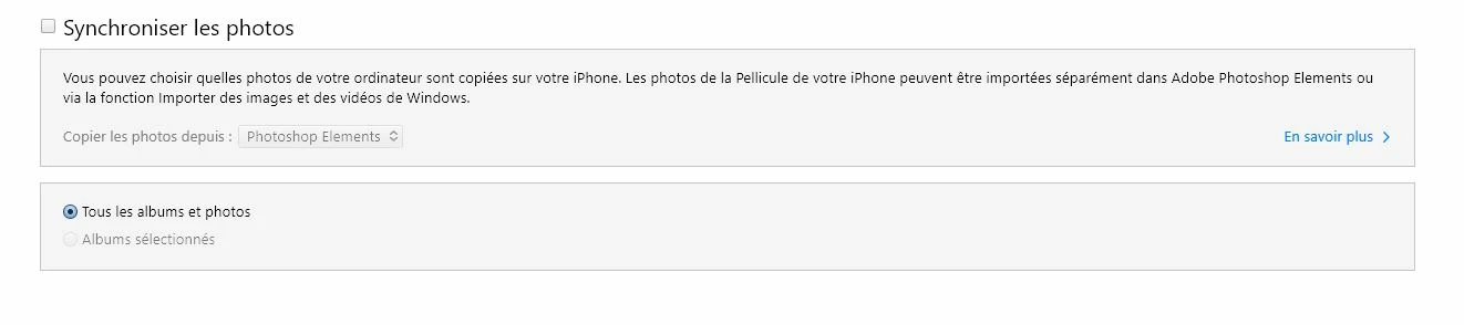 Since my update did at the end of last year in PSE 2021 and also in the n+1 issue of Itunes, when I try to use Itunes to synchronise all my photos contained in my PSE album, the menu giving the possibility of choosing photos to synchronize from your album no longer appears.