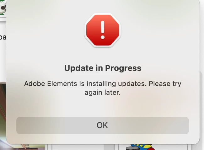 Update in Progress, Adobe elements is installing updates. Please try again later.