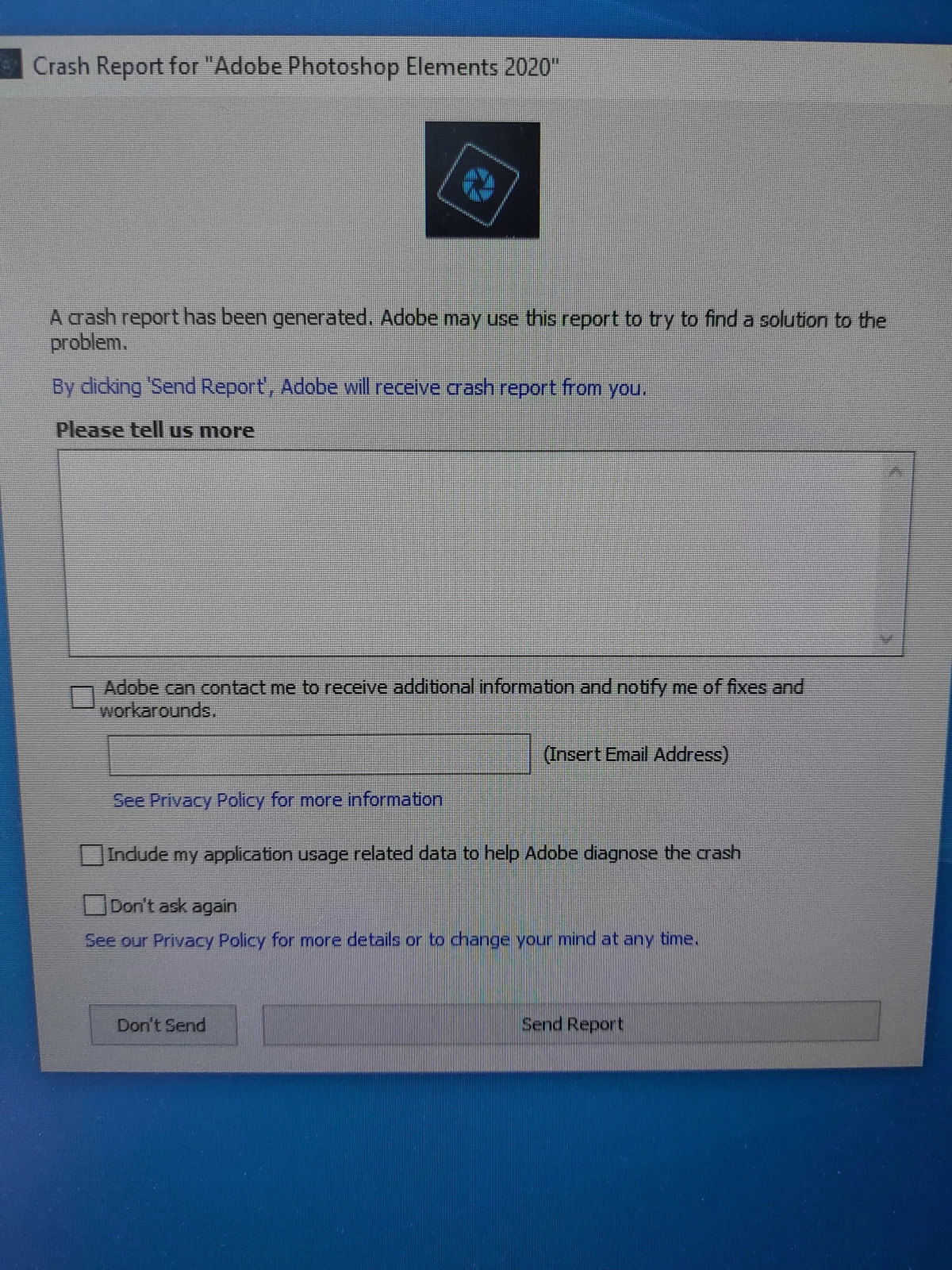 My daughter cannot access Elements and continually gets the error message shown on the attachment, saying a crash report has been reported. Repeatedly submitting this form does not cure the problem.