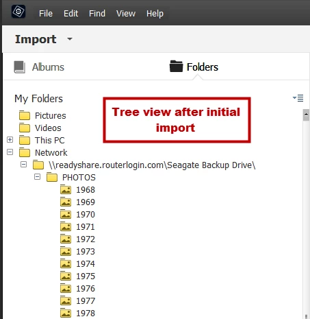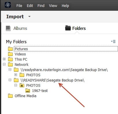 In doing a test, I created a new folder under \readyshare.routerlogin.com\Seagate Backup Drive\PHOTOS (named 1967-test) in windows explorer and placed an image in there to see if elements would pick it up and import it. It did, but it appears it has created another identical location and is now listed twice. I cannot figure out what is going on, but as you can see, the auto import ONLY pulled in the 1 new folder I created, it did not sync the rest of my already cataloged folders & files. It for some reason created an almost identical new location (see screenshot 2)