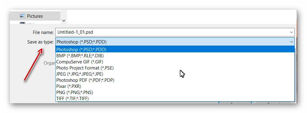 In the Save or Save As dialog, you can select your desired format by choosing from the Save as type dropdown menu: